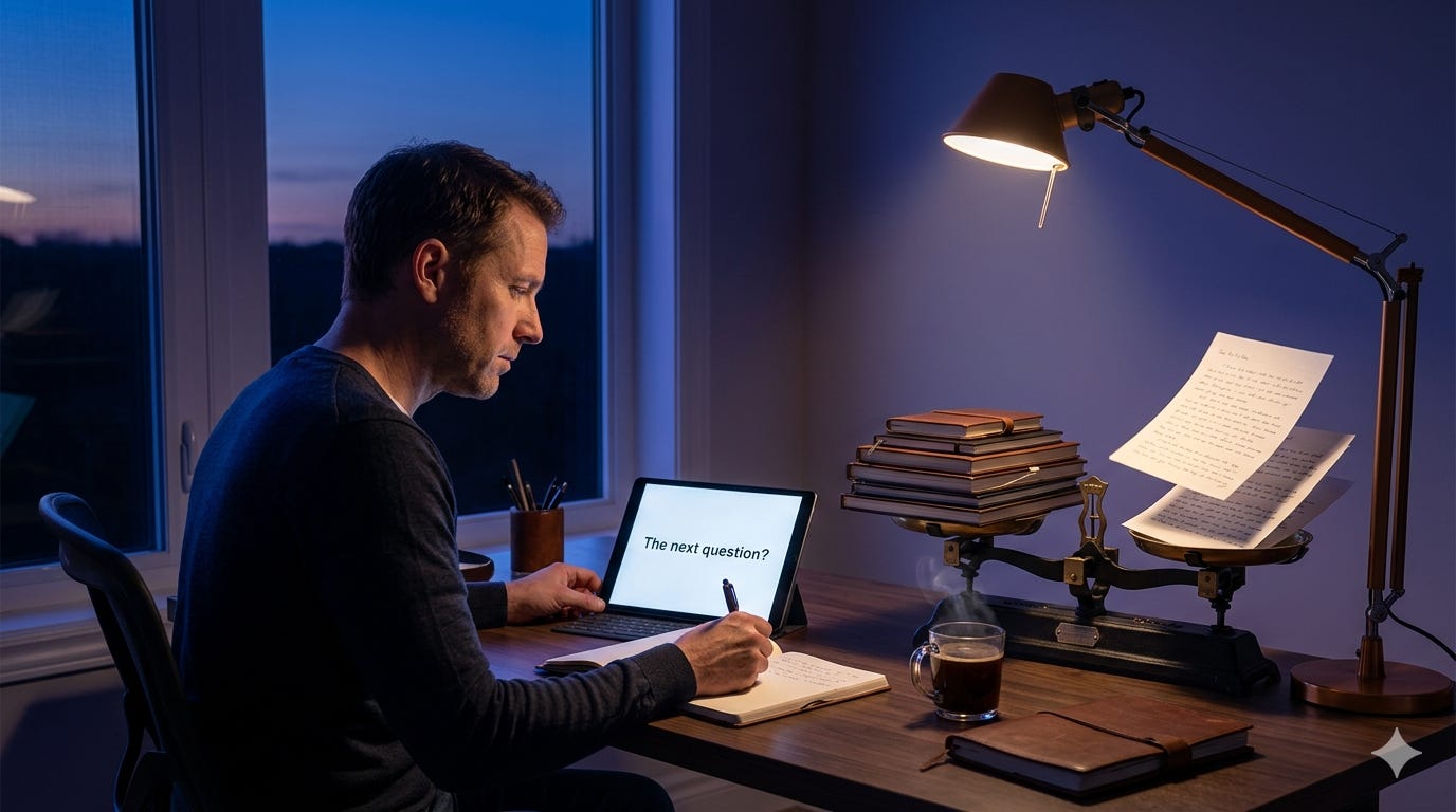 Not by more effort. Not by sitting longer or trying harder. But by the discipline to be willing to question yourself. To show up as the interviewee. To let the question do the work the blank page never could.